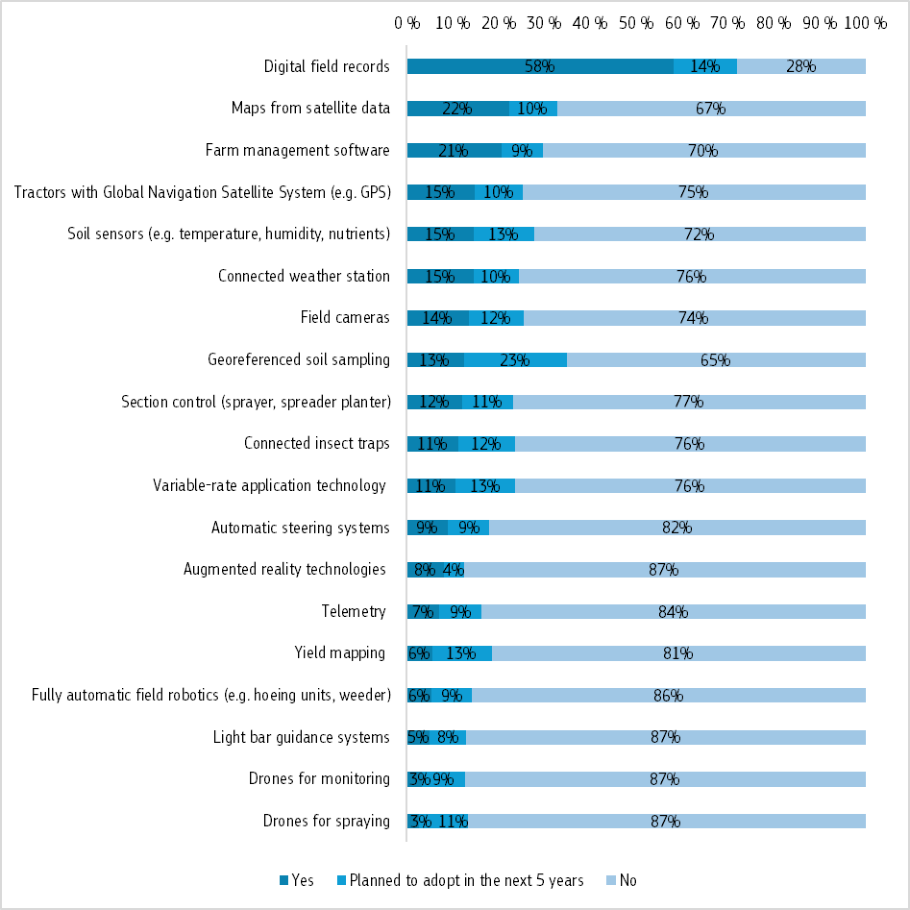 Automatic steering, telemetry, yield mapping, field robotics and light-bar guidance cluster between 5% and 9%. Planned adoption is modest for most tools, typically an additional 9 to 15% over five years. One notable exception is georeferenced soil sampling, which rises from 13% today to 23% planned, signalling interest in precision soil data.