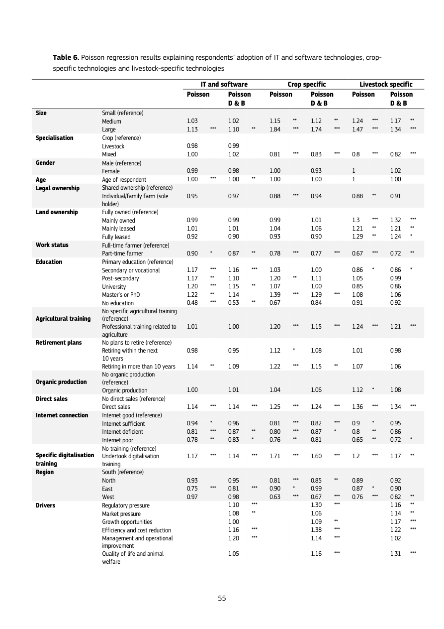 Regression analysis confirms familiar patterns. Larger farms adopt significantly more technologies, between 10% and 84% depending on category. Poor connectivity is associated with 4% to 30% fewer technologies. Direct sales, full-time farming, and specialised training are all positively associated with adoption.